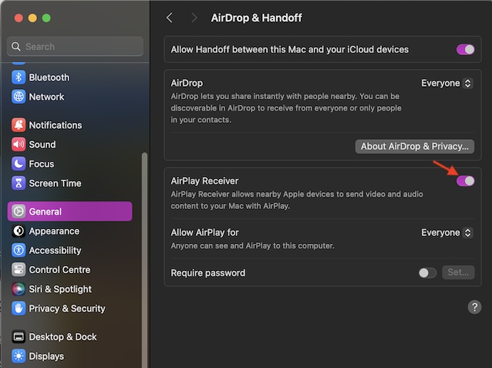 - Sur votre Mac :Accédez à l’application Paramètres système -> Général -> AirPlay et transfert. Ensuite, allumez l'interrupteur du récepteur AirPlay.