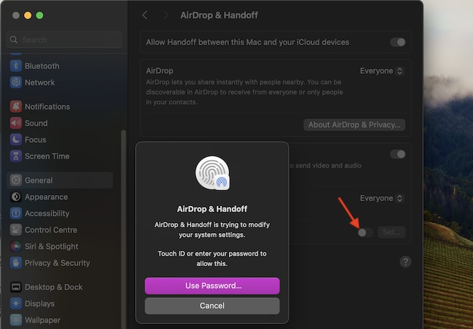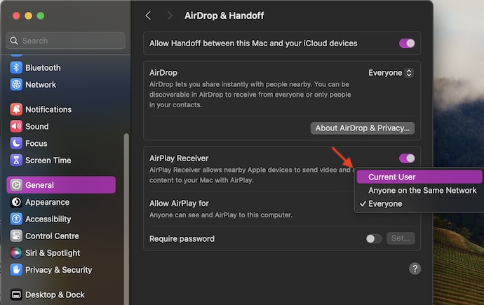- Sur votre appareil macOS :Ouvrez l'application Paramètres système -> Général -> AirPlay et transfert -> Maintenant, activez la bascule à côté de Exiger un code, puis configurez un code d'accès préféré.