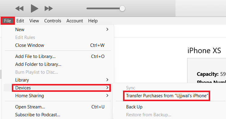 10.Dans la section Appareils, sélectionnezTransférer des achats depuis un iPhone.