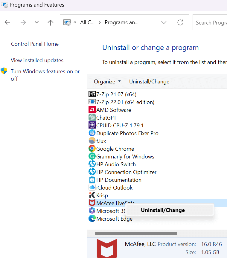 Étape 4 :Alorsclic droitsur l'application McAfee et choisissezDésinstaller/Modifier.