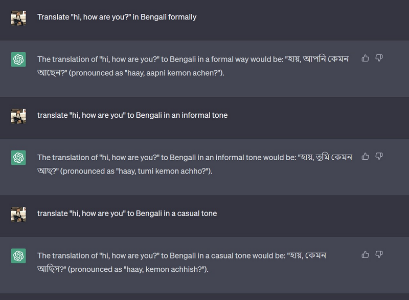 Par exemple, si vous souhaitez traduire la phrase « salut, comment vas-tu ? » de l’anglais au bengali, techniquement, il y a trois bonnes réponses. En bengali, il existe un facteur de ton formel, informel et décontracté. Par conséquent, si vous dites « salut, comment vas-tu ? » à un ami avec désinvolture, ce sera « হায়, কেমন আছিস ? (Salut, kemon achish ?), alors que si vous demandez la même chose à une personne âgée ou si vous vous adressez formellement à quelqu'un, ce sera « হায়, আপনি কেমন আছেন ? (Salut, aapni kemon achen ?).