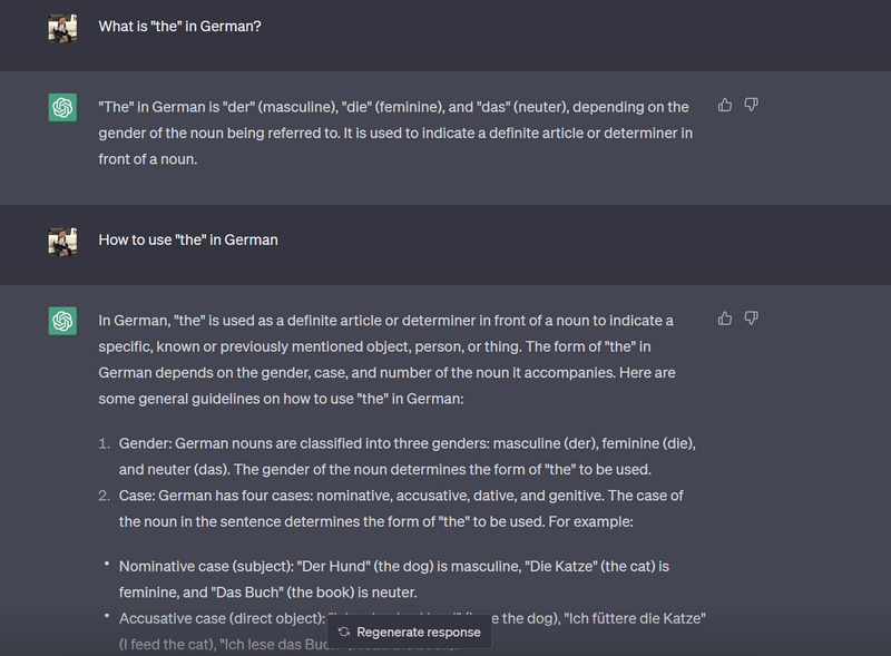 Par exemple, l’article « le » peut contenir un seul mot en anglais, mais trois mots différents en allemand : Der, Die et Das. Ces trois mots signifient « le » en anglais, bien qu’ils soient utilisés différemment en allemand. Donc, si vous souhaitez en savoir plus, vous pouvez simplement demander à ChatGPT en utilisant des invites telles que « Qu'est-ce que « le » en allemand ? ou "Comment utiliser 'le' en allemand ?"