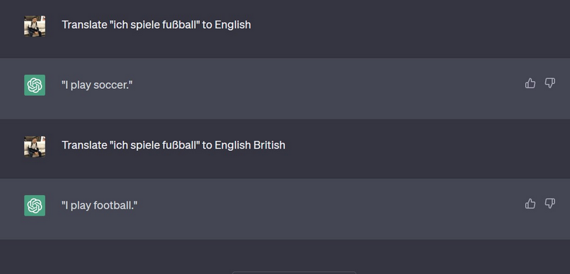 Dans ChatGPT, cependant, vous pouvez indiquer comment vous souhaitez traduire un morceau de texte. Ainsi, si vous fournissez l'invite « Traduire « ich spiele fußball » en anglais britannique », ChatGPT traduira le texte en « Je joue au football » au lieu de « Je joue au football ».