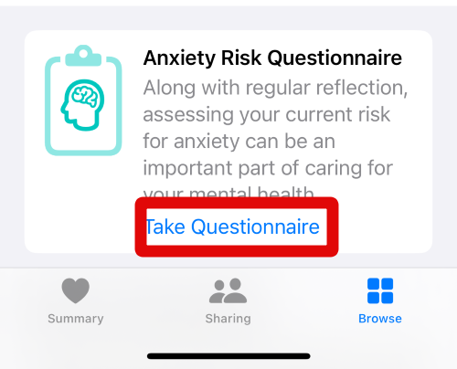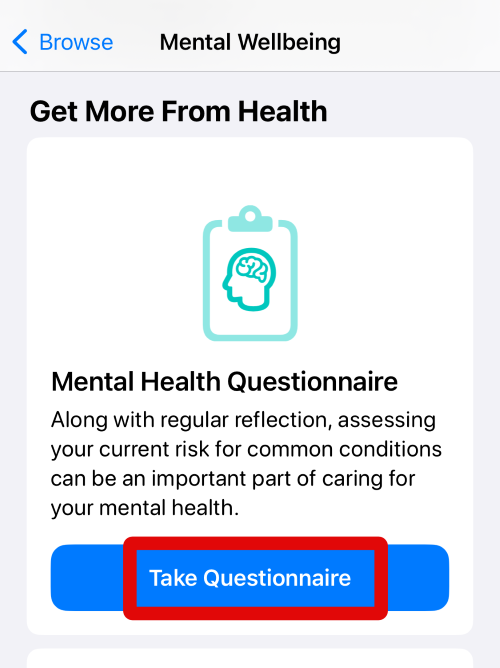 3.Faites défiler vers le bas et appuyez surRépondre au questionnairesous Obtenez davantage de la santé. Il s'agit d'un questionnaire général visant à obtenir une lecture de base de votre santé mentale.