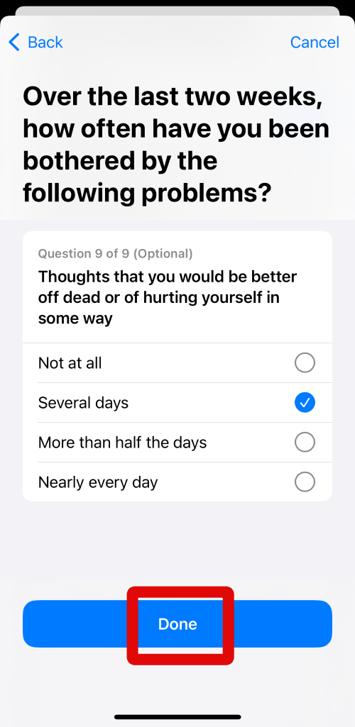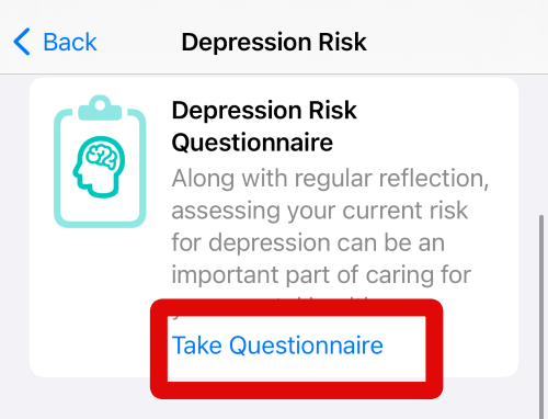 Vous pouvez réutiliser ces étapes ci-dessus pour répondre à un questionnaire sur le risque de dépression sur votre iPhone exécutant iOS 17.