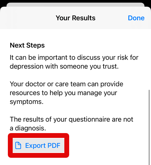 10.Si vous pensez que les résultats sont importants et que vous souhaitez les partager avec votre prestataire de soins de santé primaire, appuyez surExporter un PDFpour exporter le rapport et vos réponses au format PDF.