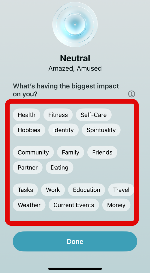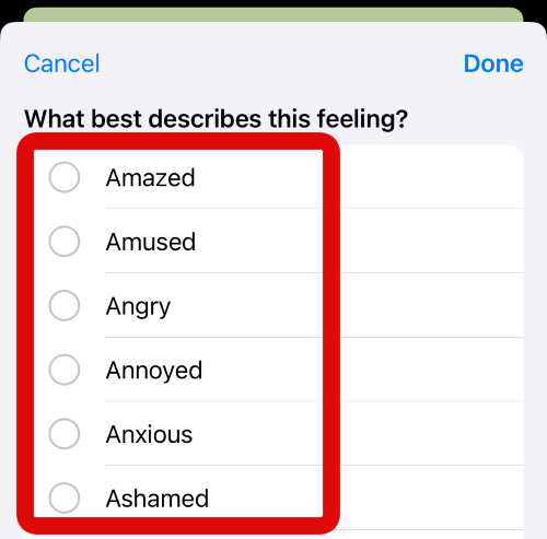 12.Maintenant, appuyez et sélectionnez tous les mots qui décrivent le mieux votre émotion. Comme auparavant, vous pouvez sélectionner plusieurs mots à la fois.
