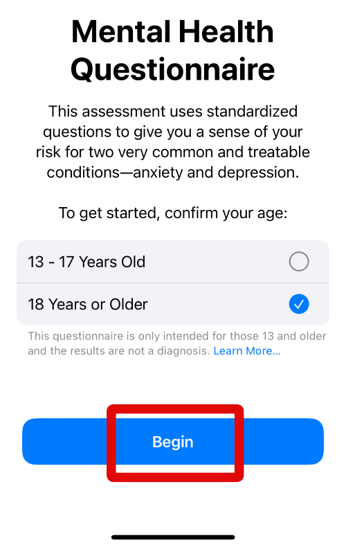 4.Il vous sera maintenant demandé de confirmer votre âge. Cela aidera l'application à juger et à quantifier avec précision vos risques pour la santé mentale. Appuyez sur et sélectionnez votre catégorie d'âge.