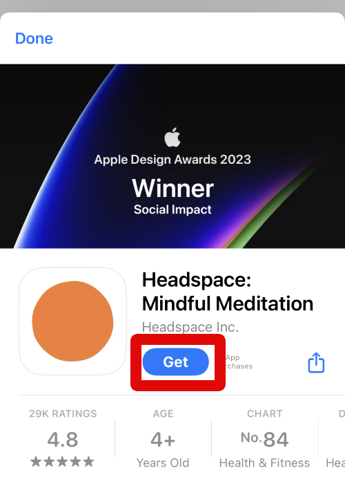 13.L'application va maintenant être téléchargée et installée sur votre iPhone. Vous pouvez désormais utiliser cette application pour vos séances de méditation afin de suivre automatiquement les données dans l'application Santé sur votre iPhone. RobinetFaitdans le coin supérieur gauche lorsque l'application a été installée.