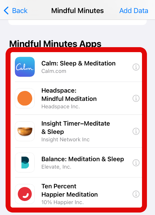 10.Vous pouvez utiliser les étapes ci-dessus pour ajouter des données pour d'autres dates si nécessaire afin de suivre votre programme de pleine conscience. Lorsque vous ajoutez les données, vous serez ramené à la page précédente. Faites défiler vers le bas et des applications vous seront suggérées que vous pouvez utiliser pour la pleine conscience sur votre iPhone sous Mindful Minutes Apps. Appuyez sur une application que vous aimez et que vous souhaitez utiliser avec l'application Santé.