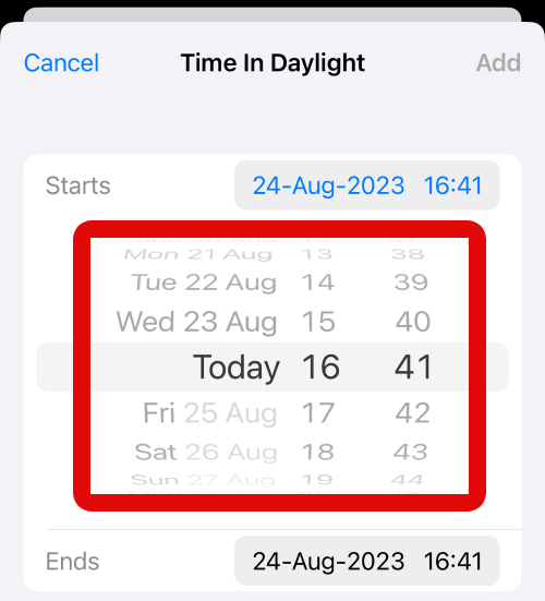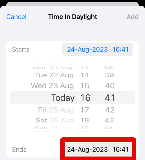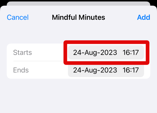 9.De même, appuyez sur la date et l'heure à côté de Fin et définissez l'heure et la date de fin de votre méditation. RobinetAjouterdans le coin supérieur droit de votre écran lorsque vous avez terminé.