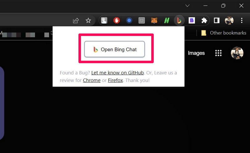 6.Maintenant, vous pouvez simplementcliquez sur l'extension BingAIsur la barre d'extension pour accéder au nouveau Bing AI Chat en tant qu'interface utilisateur superposée directement dans Chrome ou Firefox sur votre PC ou ordinateur portable.