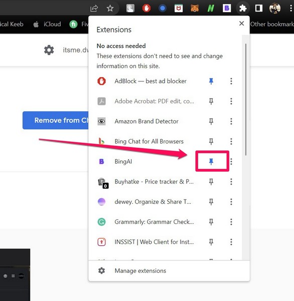 5.Ici, vous pouvez cliquer sur leÉpinglebouton pourajoutez l'extension à votre barre d'extensionqui se trouve juste à côté de la barre d'URL dans Chrome. De cette façon, vous pourrezaccéder à l'extension BingAI directement depuis la barre d'extensionlors de vos sessions de navigation.