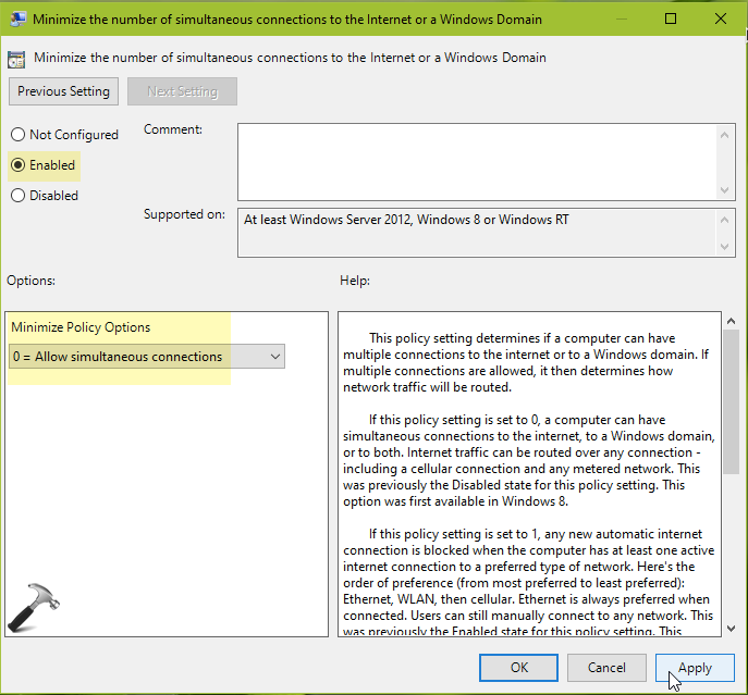 3.Double-cliquez surMinimisez le nombre de connexions simultanées à Internet ou à un domaine Windowset réglez-le surActivé.