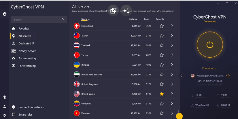 Il s'agit d'un VPN rapide et sécurisé avec lequel vous pouvez regarder n'importe quel film n'importe où. Il est livré avec un cryptage puissant de qualité militaire AES-256 bits. C’est l’un de ces VPN qui ne cesse d’augmenter le nombre de ses serveurs. Il est capable de débloquer Netflix, Amazon, Disney+ et diverses autres plateformes de streaming, comme le montre cet article de revue de CyberGhost VPN.