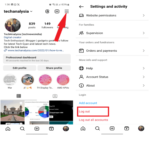 - Après vous être déconnecté, reconnectez-vous à l’aide de vos informations d’identification et vérifiez si les Instagram Reels sont désormais accessibles.