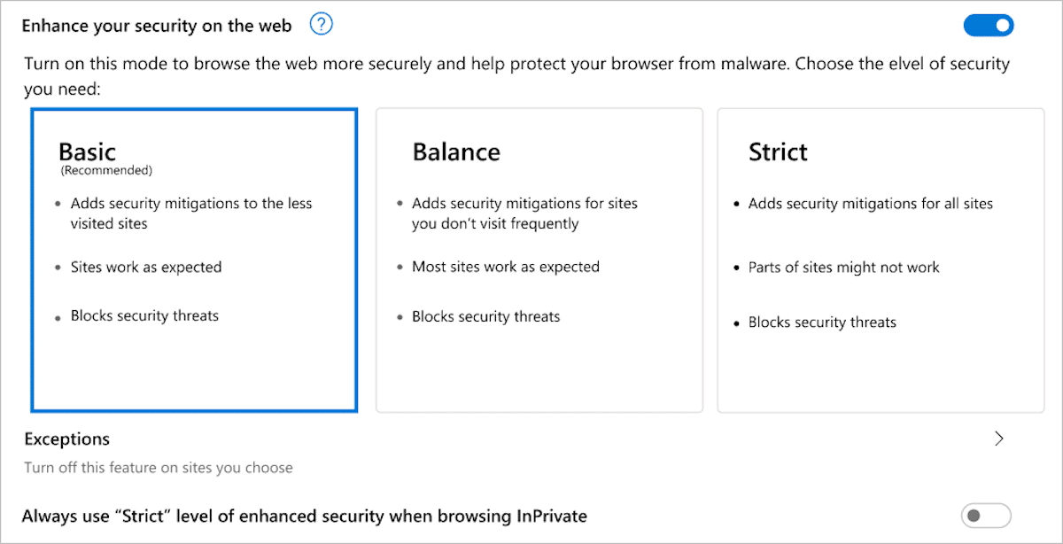 Lorsqu’il est activé, le nouveau mode de sécurité amélioré d’Edge appliquera automatiquement les paramètres de sécurité les plus stricts sur les sites Web inconnus et, au fil du temps, s’adaptera en fonction des habitudes de navigation des utilisateurs.