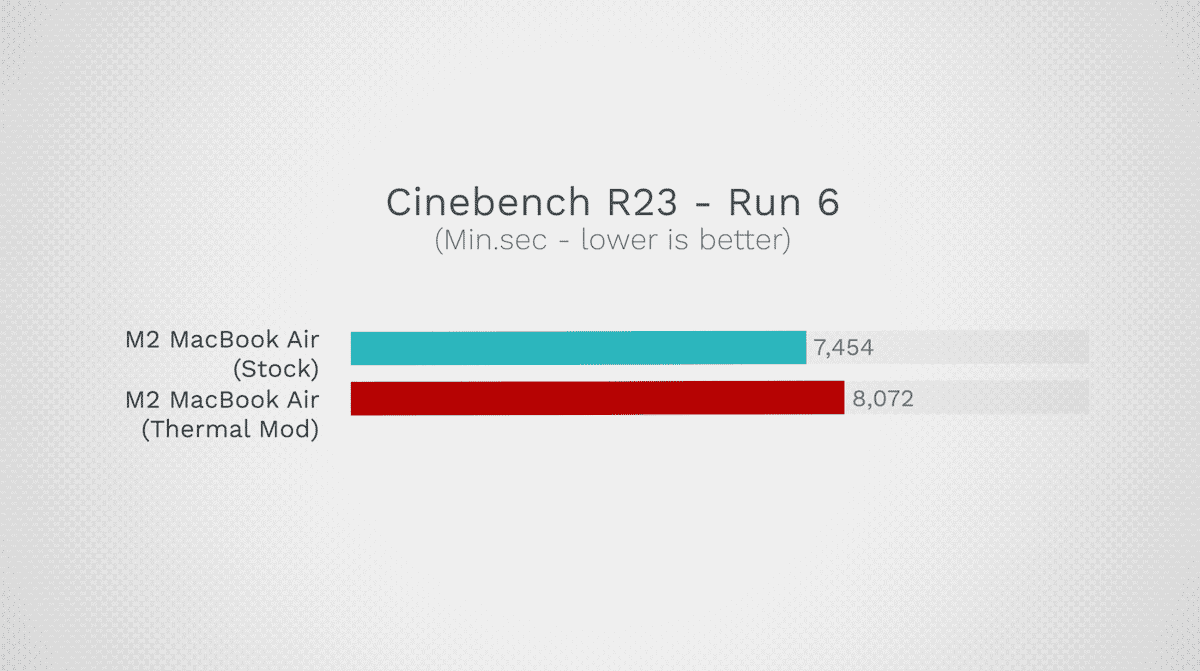 D'autres tests ont montré que l'ordinateur portable modifié obtenait de meilleurs résultats lors des tests de référence et que sa température restait 5 degrés plus froide que celle de l'ordinateur portable non modifié.