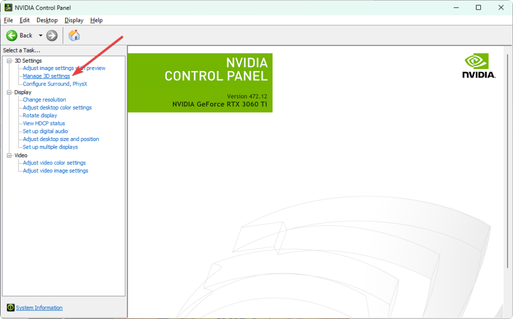 1. Ouvrez lePanneau de configuration NVIDIAet accédez àGérer les paramètres 3D.