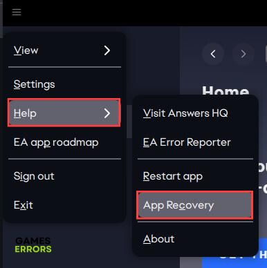 2. SélectionnerAideDans le menu contextuel, puis cliquezRécupération de l'application.