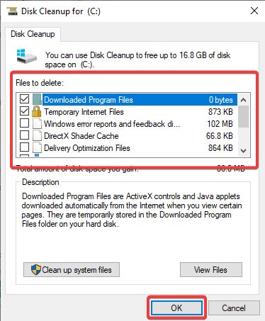 3. Dans leFichiers à supprimerSection, vérifiez les fichiers que vous souhaitez supprimer, puis cliquezD'ACCORD.