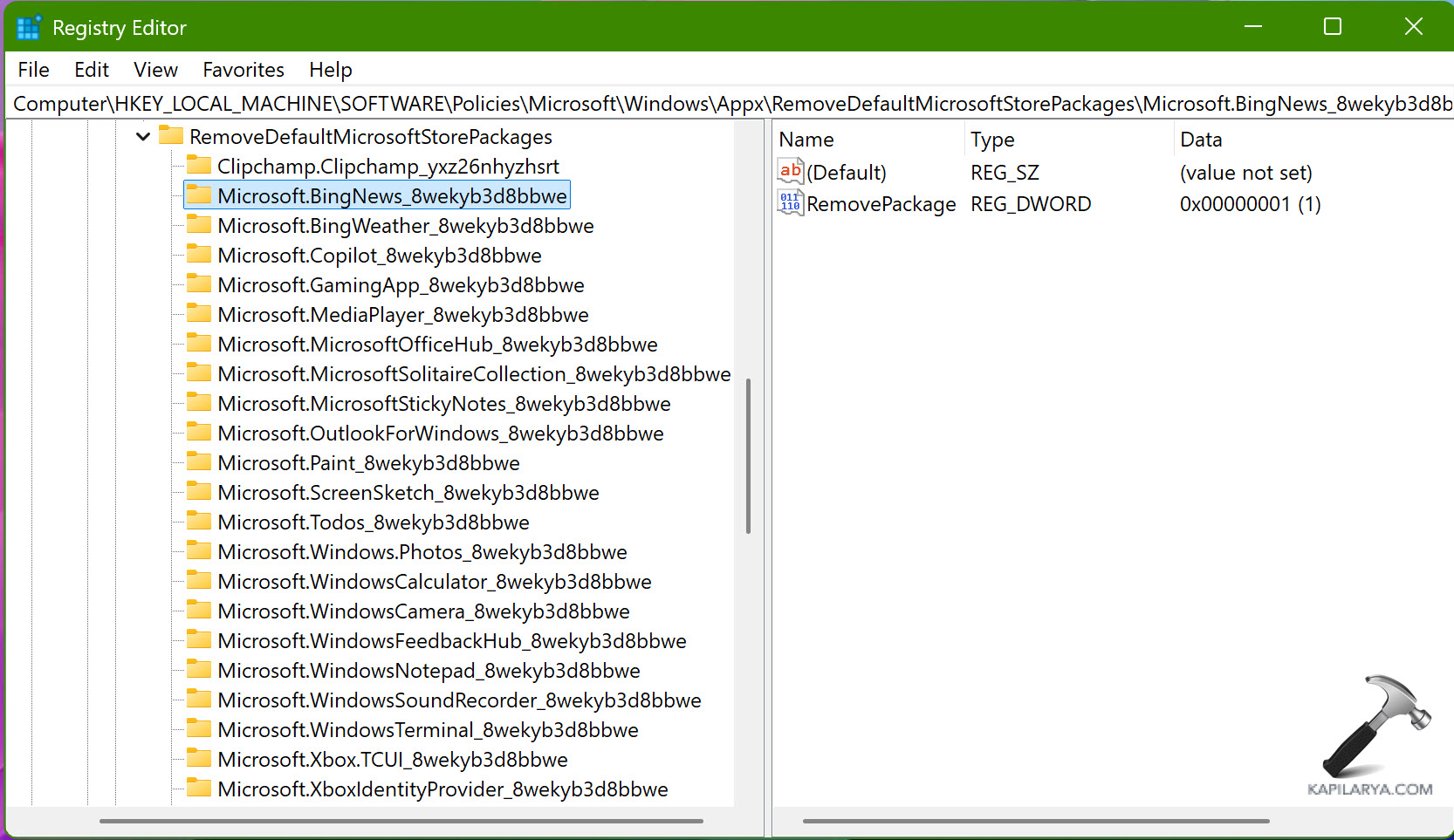 5.Vous pouvez maintenant créer une sous-clé de registre à côté de la clé de registre RemoveDefaultMicrosoftStorePackages. Nommez-le selon le tableau ci-dessous.