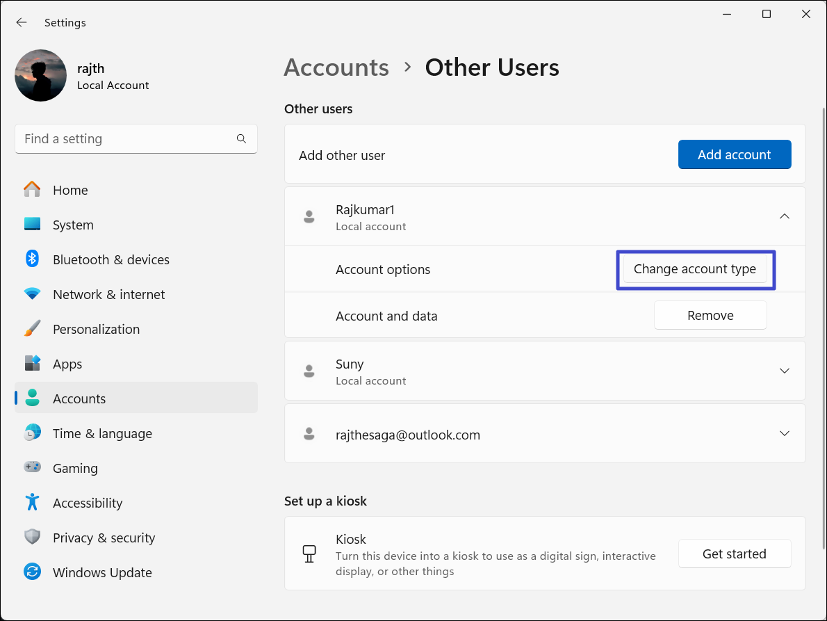Si vous n'avez pas d'autre compte administrateur, vous pouvez changer un compte local en administrateur ouactiver l'administrateur intégré dans Windows 11. Alternativement, vous pouvez créer un nouveau compte local spécifiquement pour renommer le dossier, le changer en administrateur, puis revenir ensuite à votre compte principal.