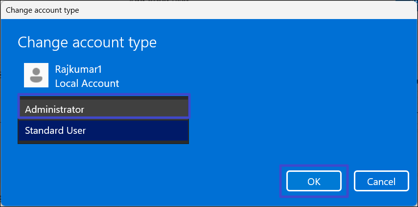 4. DuType de comptedans la liste déroulante, sélectionnez "Administrateur",et cliquez sur "D'ACCORD“.