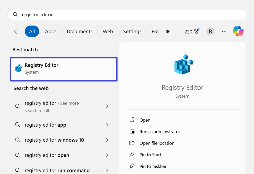 1. Dans le menu Démarrer, recherchez «Éditeur de registre », puis sélectionnez le meilleur résultat.