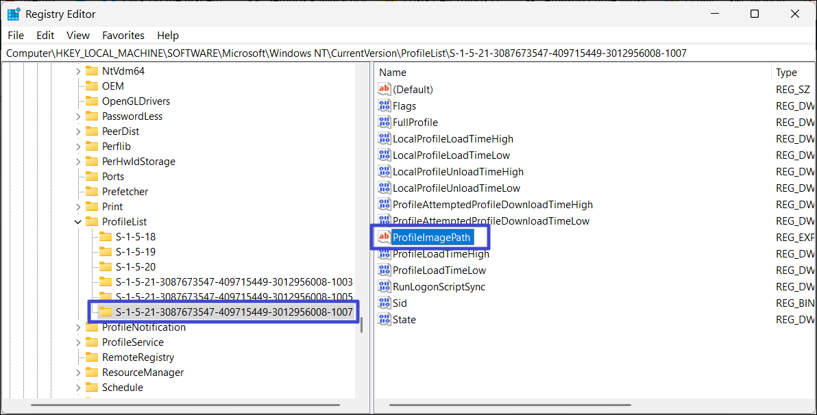 4. Une fois le SID du compte utilisateur que vous souhaitez renommer sélectionné, double-cliquez sur le bouton «ProfilImagePath"valeur.