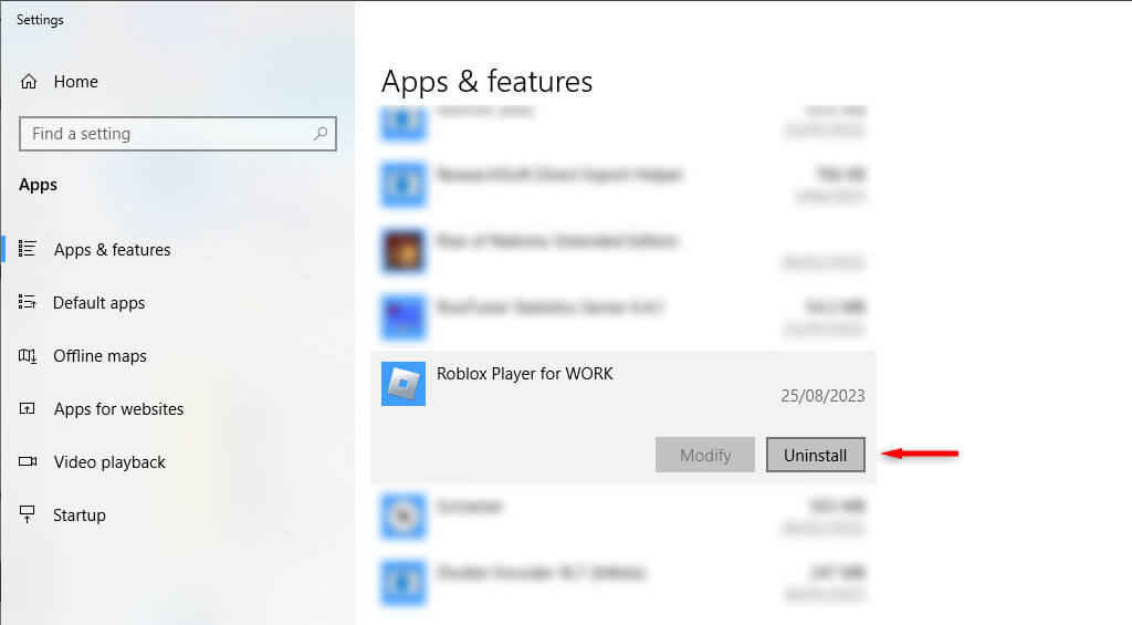 - Trouver et sélectionnerRobloxDans la liste des applications. SélectionnerDésinstaller.