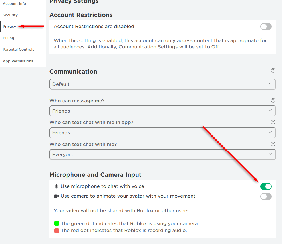 - Vérifiez que le chat vocal est activé dans Roblox. Ouvrez Roblox sur votre appareil, que ce soit un PC, Xbox, Android ou iPhone. Sélectionnez leIcône de l'équipementdans le coin supérieur droit de l'écran (près de votre icône de compte Roblox) et sélectionnezParamètresdans le menu déroulant. Ouvrir leOnglet de confidentialitéet assurez-vousUtilisez le microphone pour discuter avec la voixest basculé.