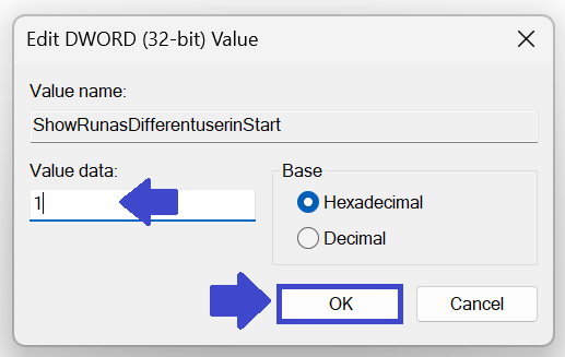5. Double-cliquez sur «ShowRunasDifferentuserinStart» et définissez la valeur sur 1. Cliquez sur OK.