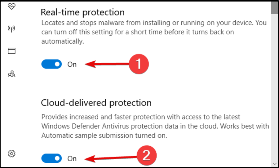5. Désactivez leProtection en temps réelet les options de protection fournies par le cloud, en désactivant les boutons indiqués ci-dessous.