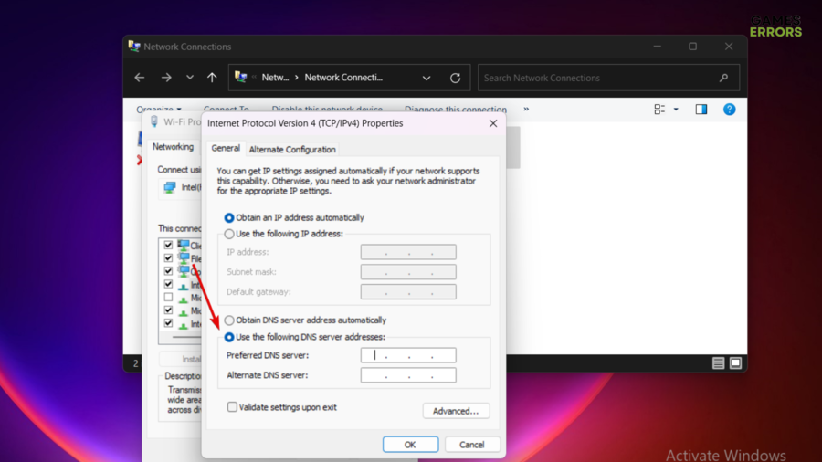 6. Dans leServeur DNS préféréoption, définissez ceci : 8.8.8.8. Puis, dans leServeur DNS alternatifdéfinir ce qui suit : 8.8.4.4.