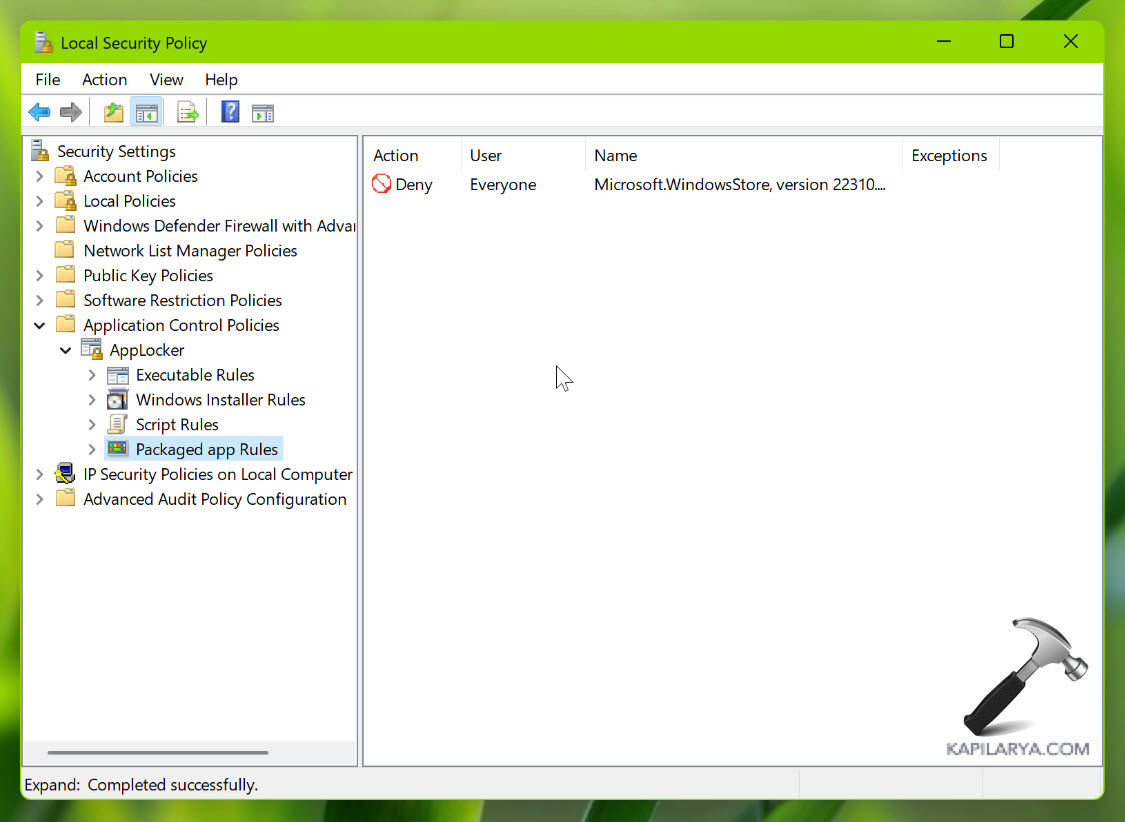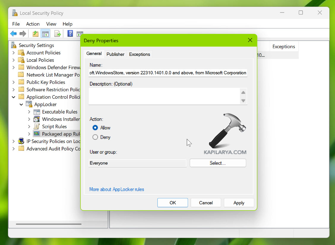 Une fois que vous avez défini l'action surPermettreet cliquez sur Appliquer suivi de OK, la boutique Microsoft sera autorisée pour tout le monde ou les utilisateurs configurés pour cette règle. N'oubliez pas que vous pouvez également supprimer cette règle afin d'activer le Microsoft Store pour tous les utilisateurs.