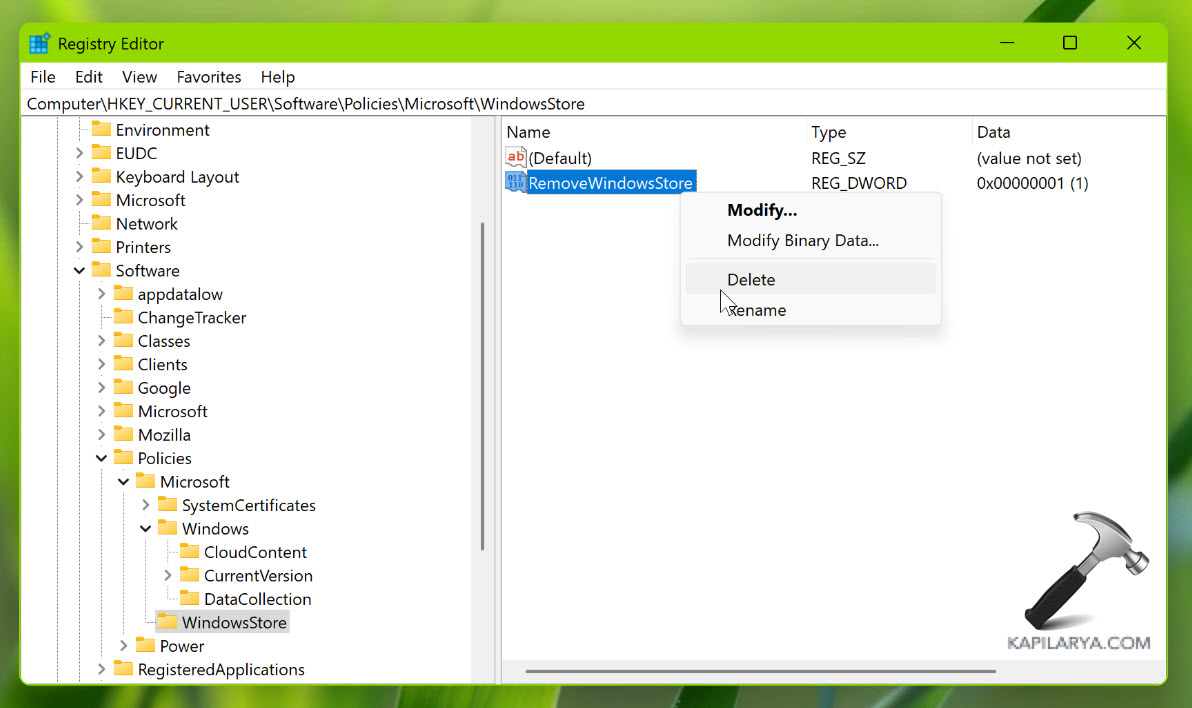 4. Semblable à l'étape 3, supprimez également le registre RemoveWindowsStore DWORD de l'emplacement de registre suivant, s'il existe :