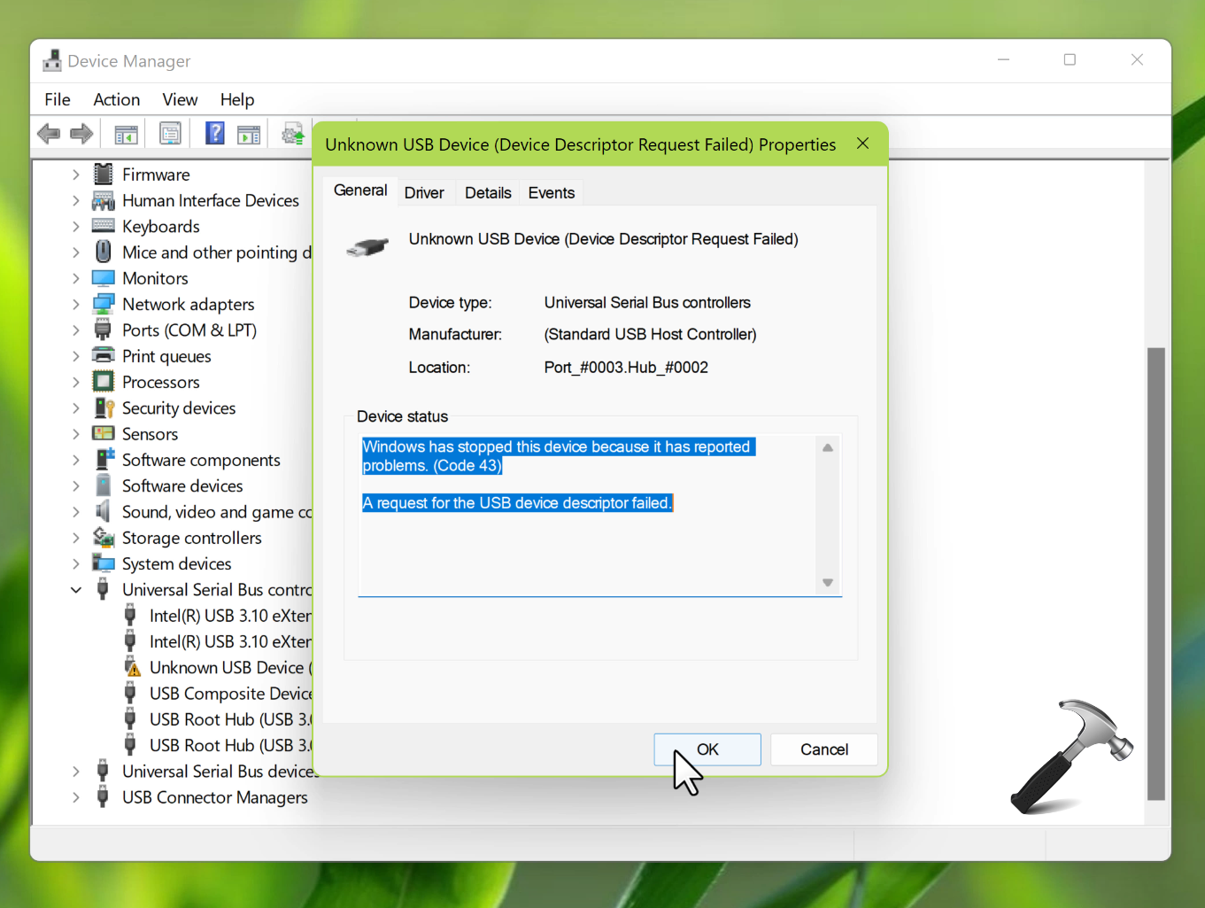 De plus, si nous double-cliquons sur l'appareil dans l'onglet Général de la feuille de propriétés, vous pouvez localiser le code d'erreur 43.
