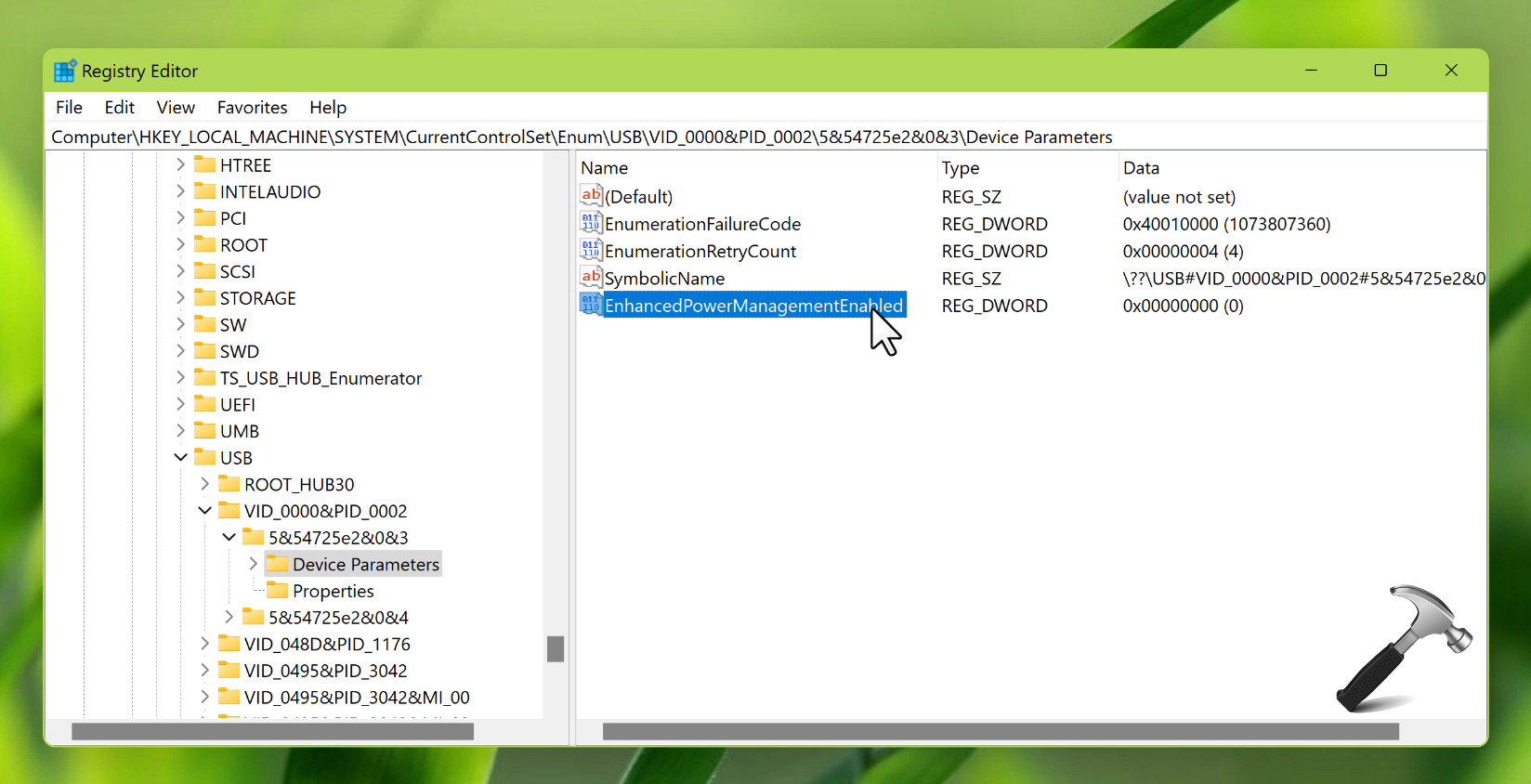 6.Dans le volet droit de la sous-clé de registre Paramètres du périphérique, cliquez avec le bouton droit et sélectionnez Nouveau > Valeur DWORD. Nommez le DWORD nouvellement créé commeEnhancedPowerManagementEnabled. Définissez ce registre DWORD sur 0.