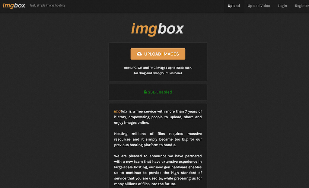 Si vous recherchez une plate-forme permettant un partage rapide et sans tracas de vos fichiers, Imgbox est l'un des meilleurs choix pour vous. Il offre un stockage illimité gratuitement et il n’y a pas de date d’expiration pour vos images téléchargées. La seule limitation est que vous ne pouvez pas télécharger un seul fichier de plus de 10 Mo.