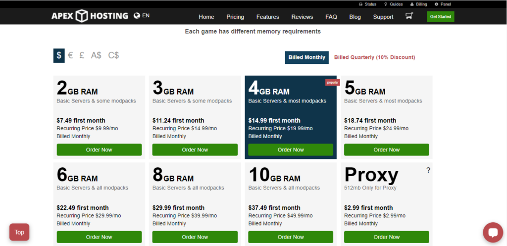De plus, cette société d'hébergement de serveurs Minecraft dispose d'un outil de chat d'assistance client en direct 24h/24 et 7j/7. Apex Hosting propose l'installation en un clic de 150 modpacks, dont SkyFactory, Pixelmon et RLCraft. Si votre budget est limité, vous commencez avec leur serveur proxy de 512 Mo à seulement 2,99 $ par mois.