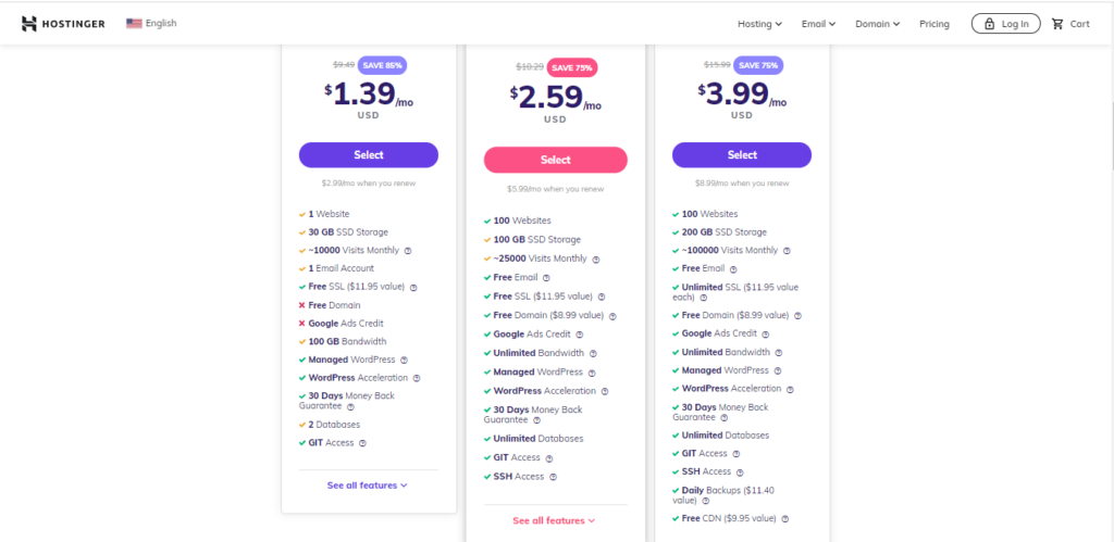 Les plans d'Hostinger offrent une protection DDoS et ont une disponibilité de 99,99 % sur leur accord de niveau de service (SLA). Par conséquent, ils fournissent également MySQL gratuit, un accès aux fichiers Web/FTP et des sauvegardes automatiques hors site.