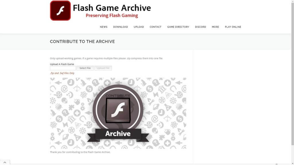 Vous pouvez télécharger des jeux Flash dans les archives en utilisant l'option Télécharger sur le site Web. Tous les fichiers requis pour exécuter le jeu doivent être compressés dans un seul fichier ZIP et téléchargés à l'aide de cette page. Pour autant que nous sachions, les demandes directes d'ajout de jeux aux archives sont réservées aux abonnés FGA Patreon.