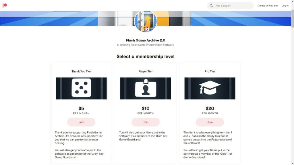 Il existe trois niveaux :Gris,Bleu, etOr. Ceux-ci coûtent 5 $, 10 $ et 20 $ par mois. Les trois niveaux voient leur nom inscrit dans le logiciel, mais si vous êtes un Gold Patreon, vous pouvez demander que les jeux qui vous intéressent soient placés dans la section En vedette, afin que davantage de personnes y jouent probablement.