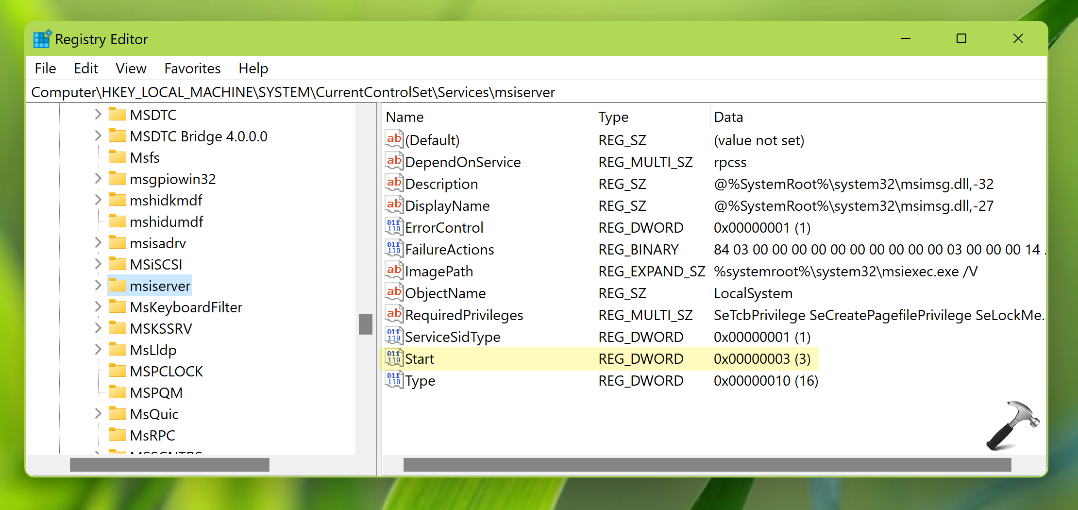 2. Allez àHKEY_LOCAL_MACHINESYSTEMCurrentControlSetServicesmsiserver.
