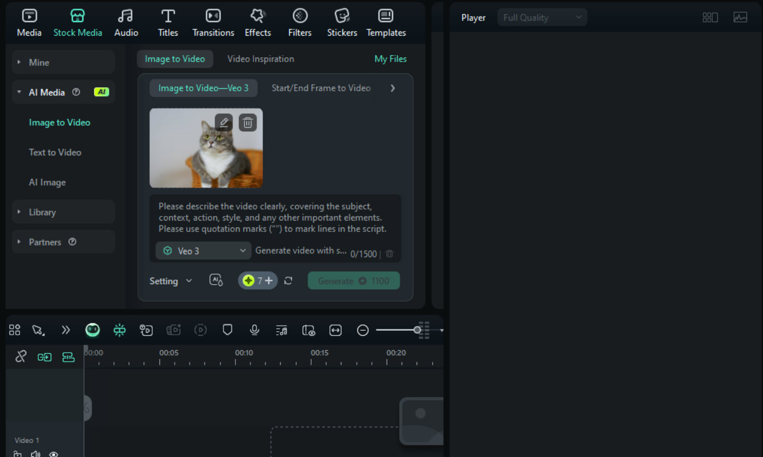 Une fois vos photos téléchargées, décrivez votre scène ou votre idée dans la zone d'invite. Sélectionnez ensuite VEO 3, le puissant modèle de génération de mouvements de Filmora, pour ajouter automatiquement des transitions réalistes, de la profondeur et des mouvements fluides. Cliquez sur Générer une vidéo pour prévisualiser le résultat.