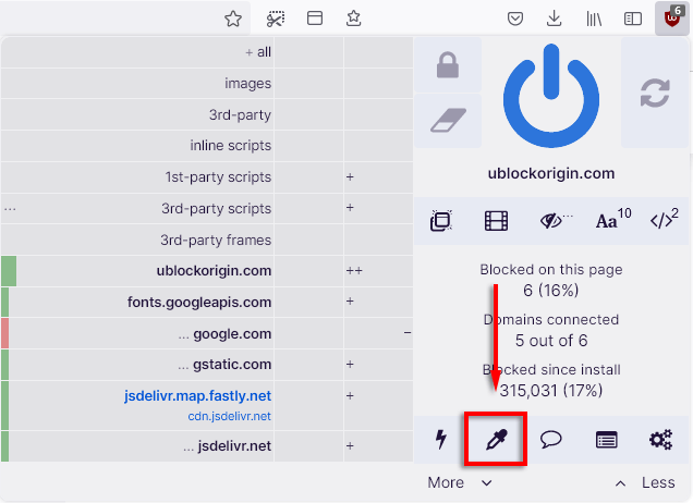 Pour utiliser le sélecteur d'éléments, cliquez sur le boutonicône uBOet cliquez sur lecompte-gouttes de couleur.
