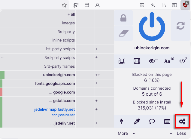 Pour afficher ces filtres, ouvrez le tableau de bord uBO en sélectionnant l'icôneicône de rouage.