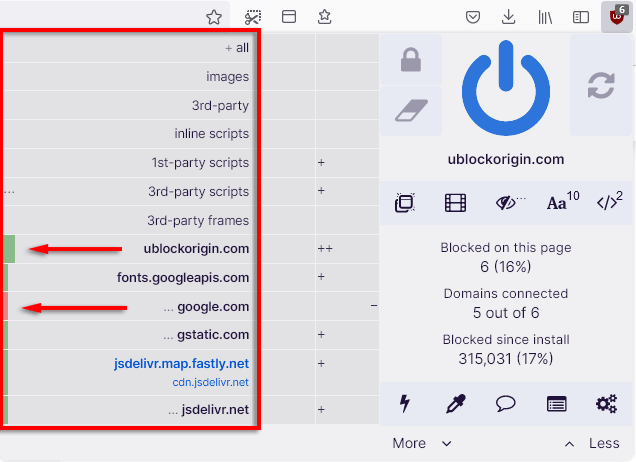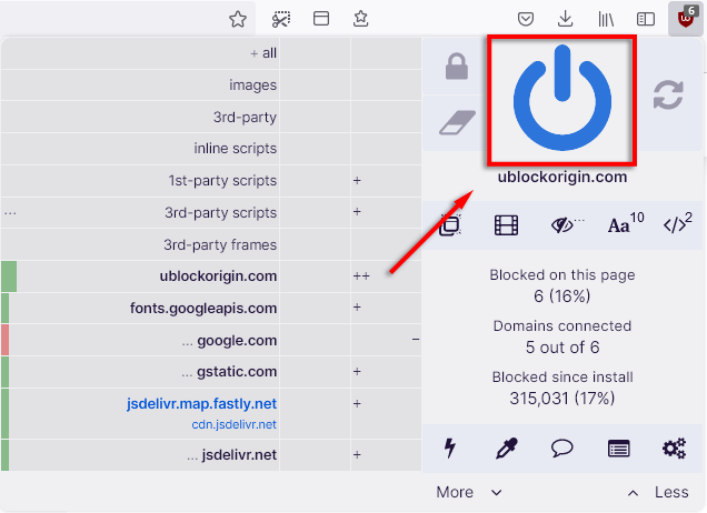 - Cliquez sur lebouton d'alimentation bleupour désactiver uBO sur un site Web ou maj + cliquez sur lebouton d'alimentation bleupour le désactiver pour une page individuelle.
