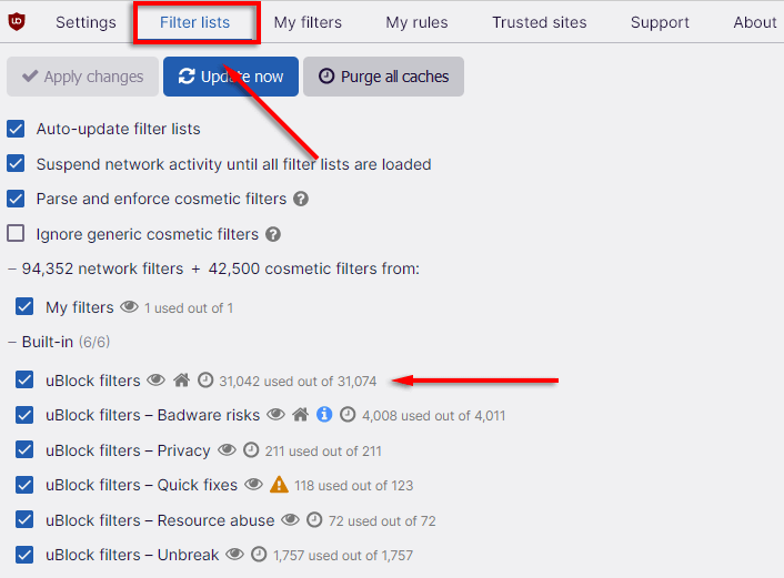 uBO est livré avec plusieurs listes de filtres intégrées et tierces. Ceux-ci peuvent être activés ou désactivés à volonté pour augmenter votre confidentialité en ligne.